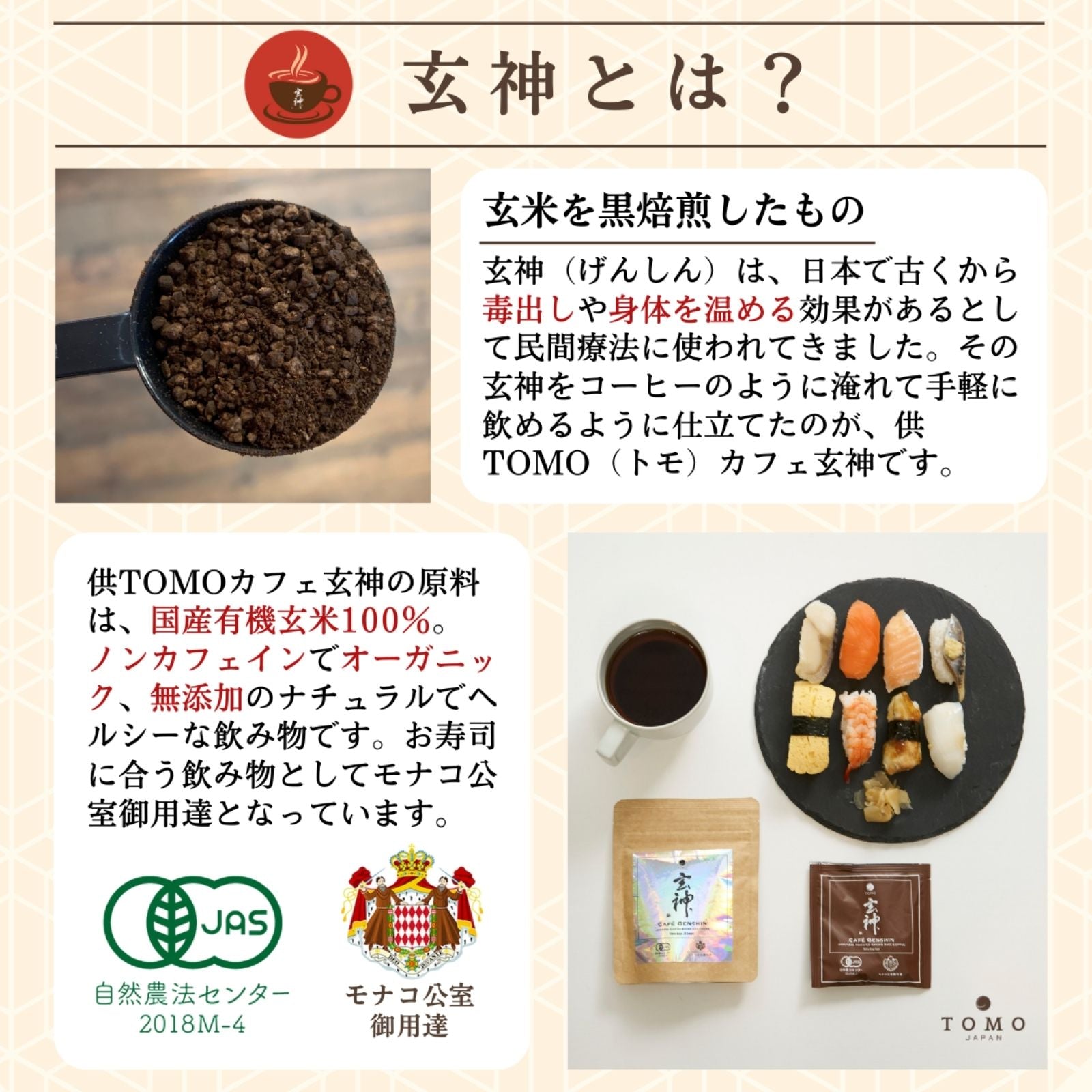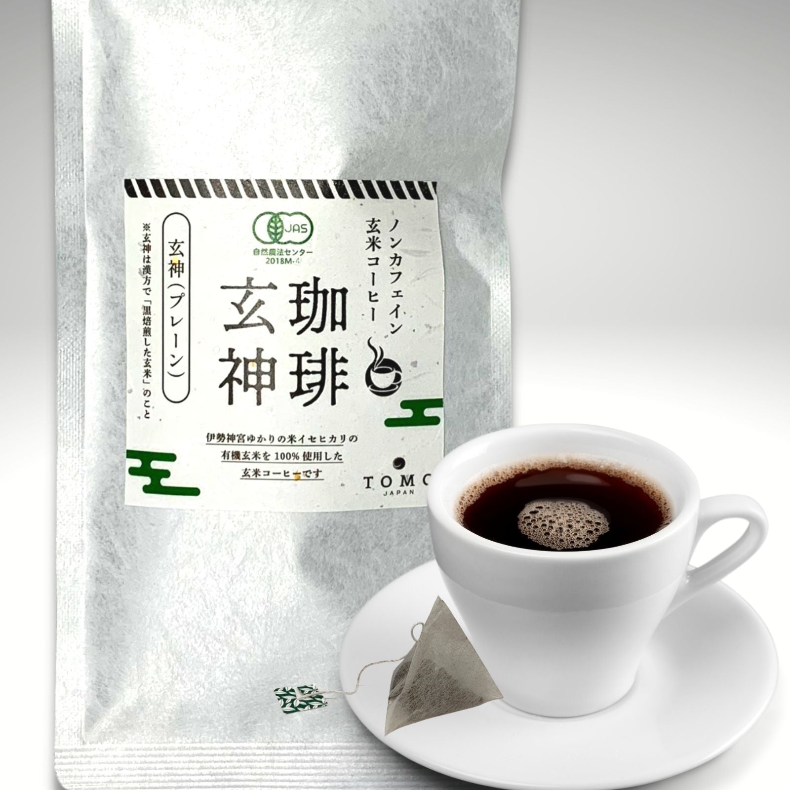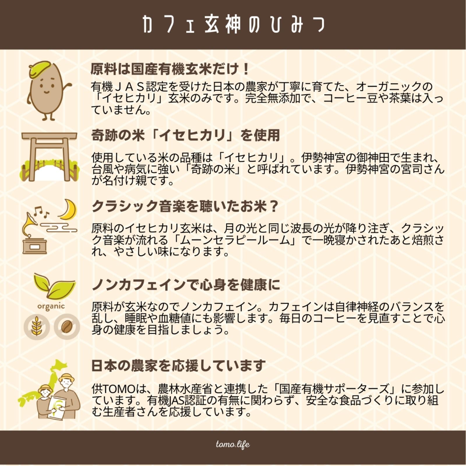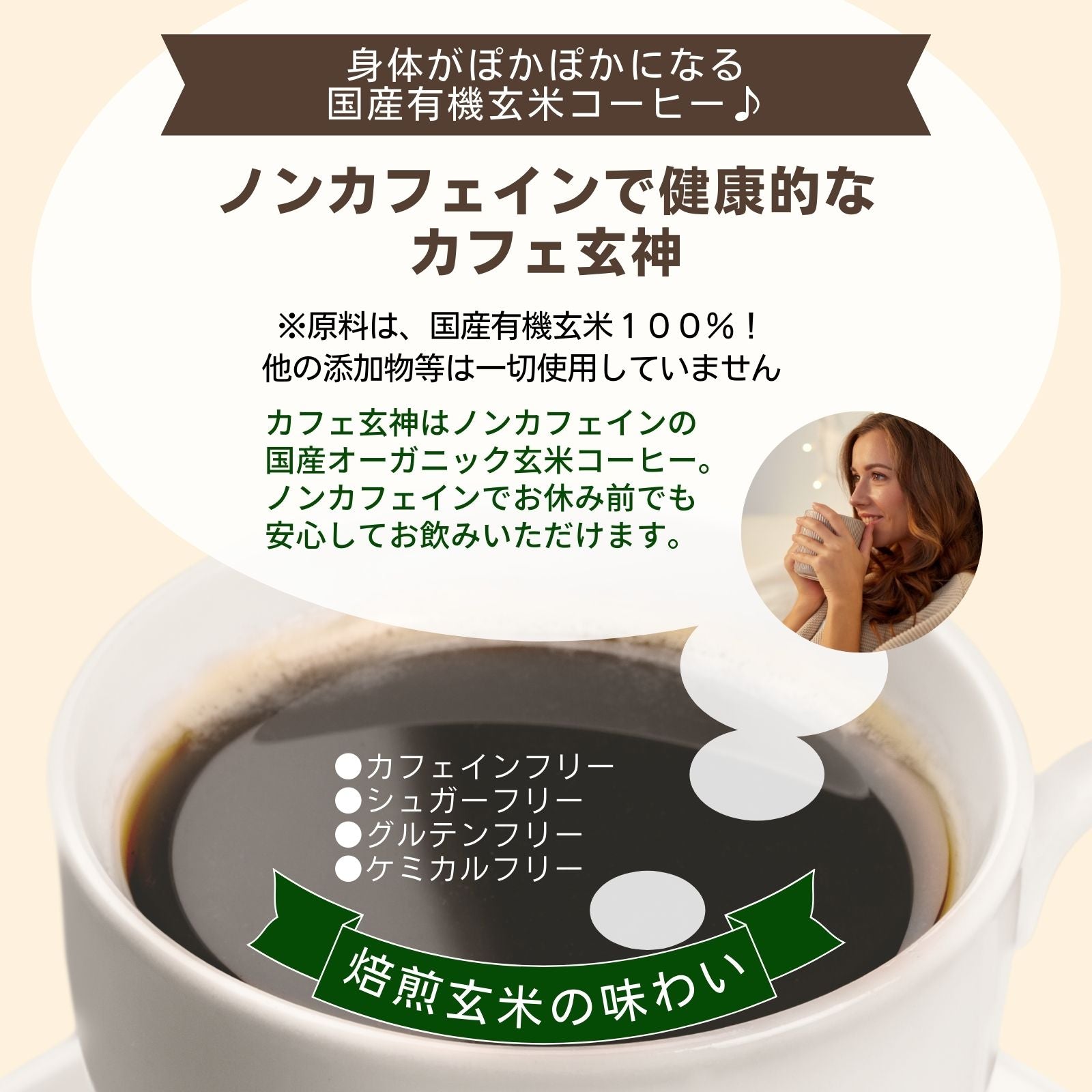 国産の有機玄米をじっくりローストし、コーヒーのように淹れて飲むカフェ玄神。 原料が玄米なのでノンカフェイン。眠りを妨げることなく、本当のリラックスが得られます。テトラバッグ(ティーバッグ)タイプで、1包で3~4杯淹れていただけます。