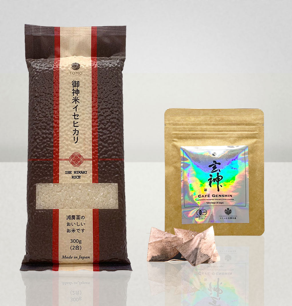 Enjoy this original Japanese gourmet gifts set with Isehikari rice and Café Genshin roasted brown rice coffee.