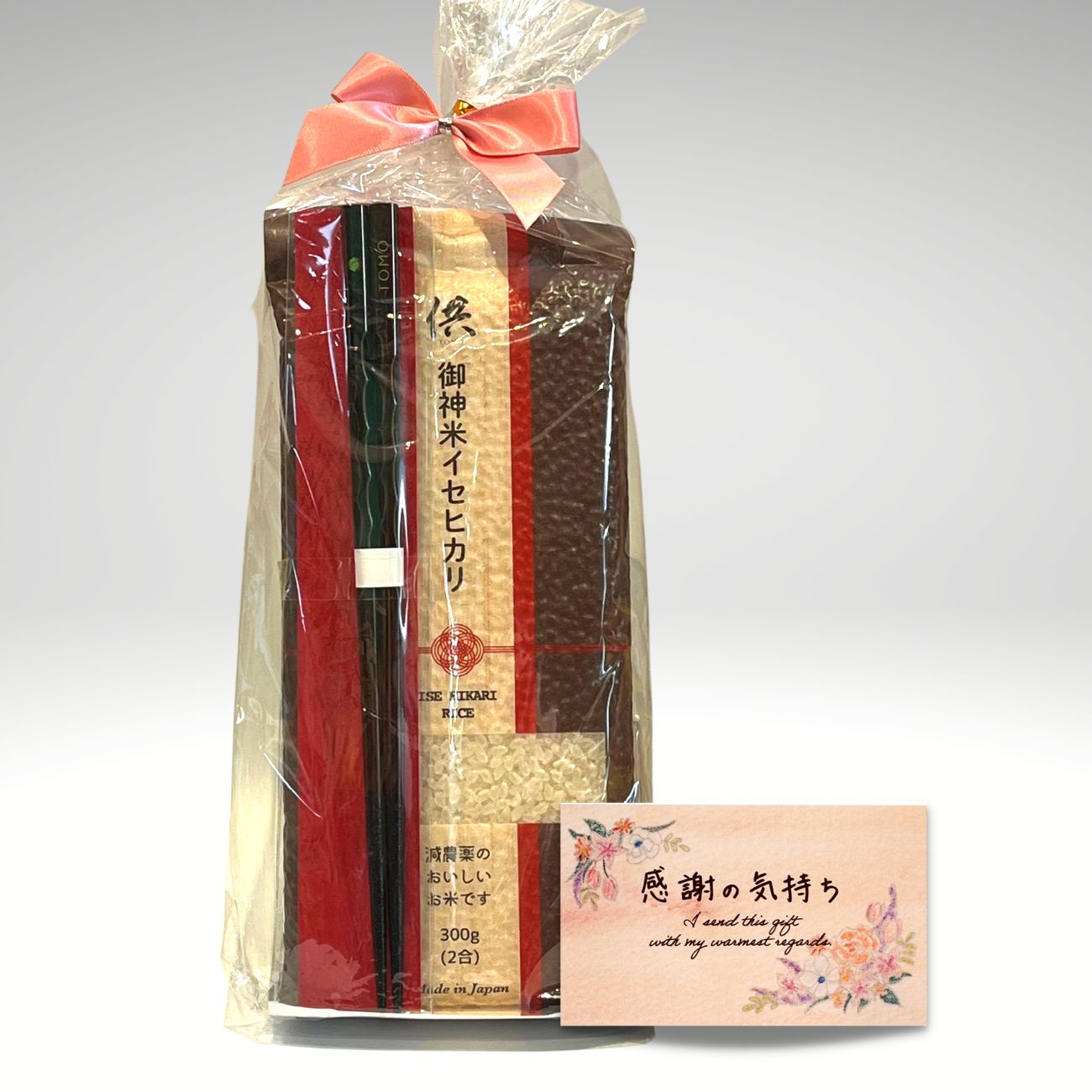 This gourmet gift contains 3 tablets of Isehikari rice, 1 pairs of authentic chopsticks and 1 message card.