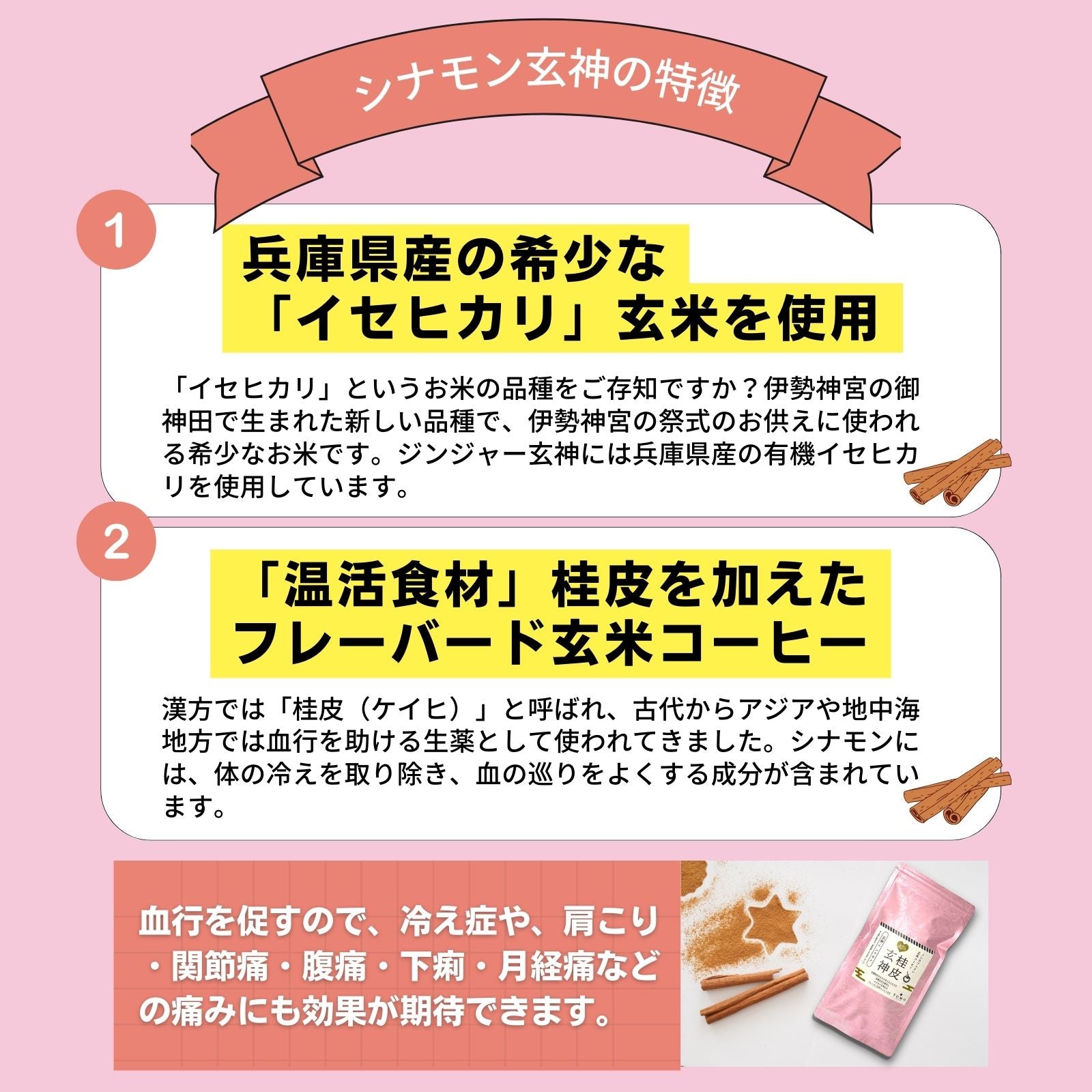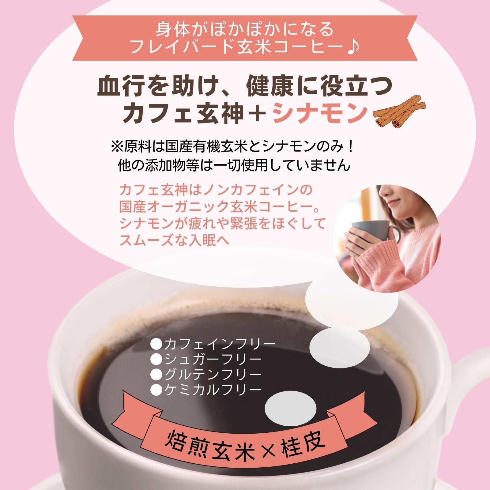 Cinnamon Genshin is a Japanese brown rice coffee blend that combines the rich, roasted flavor of organic brown rice with the sweet and spicy aroma of cinnamon.